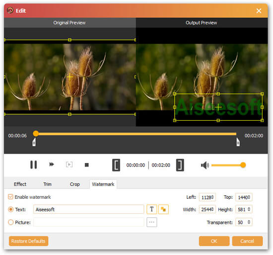 Ao criar um disco DVD com arquivos de vídeo, especialmente vídeos gravados por você, às vezes você não fica satisfeito com o efeito de vídeo. Não se preocupe. Aiseesoft DVD Creator fornece várias opções de edição para embelezar o efeito de vídeo. Você pode ajustar o brilho, saturação, matiz e contraste do vídeo. Se o vídeo for longo, mas você só precisa de uma determinada parte, use a função Trim. Para ajustá-lo à tela, você pode alterar a proporção e cortar as bordas pretas. Para torná-lo mais especial, adicione algumas palavras ou imagens como marca d'água.