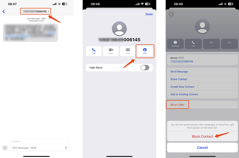 Open the Messages app and scroll through your recent conversations to find the specific number you want to block. You can also tap Filters and choose Unknown Senders to locate it quickly. Open the text message and tap its number or contact name. Tap info and then select Block Caller. Tap Block Contact to proceed with the blocking action.