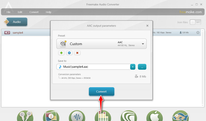 Além disso, você pode utilizar o Freemake Audio Converter para ajudá-lo a compactar arquivos AC3 para reduzir o tamanho da mídia de áudio. Ele oferece suporte para muitos formatos de áudio. Além disso, permite que você execute o processamento de arquivos em lote. Da mesma forma, você pode restringir o tamanho de seus arquivos AC3 alterando os canais, codecs, taxa de quadros e taxa de amostragem. Se você deseja enviar músicas para o iTunes ou serviços de armazenamento em nuvem, pode usar este programa. Por outro lado, siga o guia do usuário abaixo para ajudá-lo a executar o AC3 compressão de áudio.