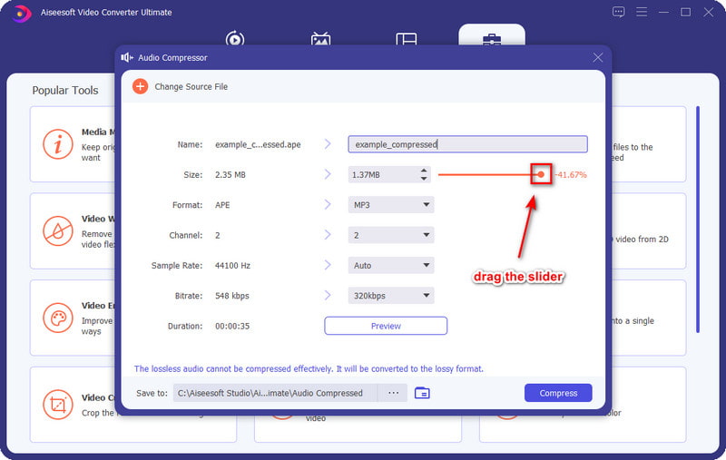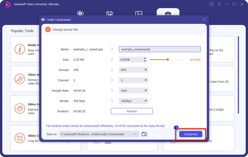 Aiseesoft Video Converter Ultimate fornece a melhor compressão de áudio APE que você não pode ter com o outro compressor no mercado. É superior na compactação do seu arquivo APE favorito em um tamanho muito menor, mas preserva a qualidade. Além disso, você pode converter o arquivo de áudio APE em outro formato enquanto ele está sendo compactado. A vantagem de usá-lo é que você não precisará de conhecimento especializado sobre como usá-lo porque esta ferramenta é para todos com ou sem aprendizado sobre compactação. Você pode dominar todas as suas funções e recursos em menos de um minuto, para dizer mais fácil.