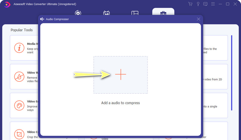 Na interface principal da ferramenta, você verá as quatro guias principais. Navegue até o Caixa de ferramentas guia para ver a lista de funções oferecidas pelo programa. A seguir, clique no Compressor de áudio para iniciá-lo e começar a compactar arquivos de áudio.