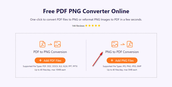 Quando se trata da conversão de PNG para PDF, o Aiseesoft Free PDF PNG Converter Online é uma ferramenta útil para converter várias imagens PNG em um único arquivo PDF. Não há limite de tamanho de arquivo, nenhum registro necessário e nenhuma marca d'água adicionada. E a conversão não prejudicará a qualidade. Você pode se sentir livre para usar. Para converter suas imagens PNG em PDF, você pode seguir os Passos abaixo.