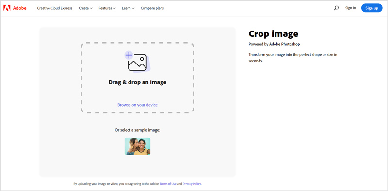 Adobe Creative Cloud Expresso é um editor de imagens on-line muito popular desenvolvido pelo Adobe Photoshop. Ele pode funcionar como uma ferramenta de corte de imagem on-line para ajudá-lo a corte suas fotos. É compatível com a maioria dos formatos de imagem, como JPG, PNG, TIF, TIFF e muito mais. Você pode seguir as etapas abaixo para cortar sua imagem online.