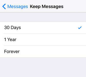 Acesse Configurações> Mensagens> Manter Mensagens, aqui você pode selecionar o tempo (30 dias/1 ano/para sempre) para o qual deseja manter suas conversas. A remoção de mensagens de texto e arquivos multimídia pode liberar espaço no iPhone e torná-lo mais rápido.