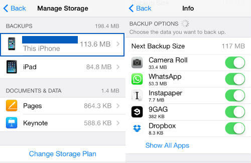 ✦ Para iOS 7 ou versão inferior, vá para Configurações > iCloud > Armazenamento e backup, toque em Gerenciar Armazenamento.