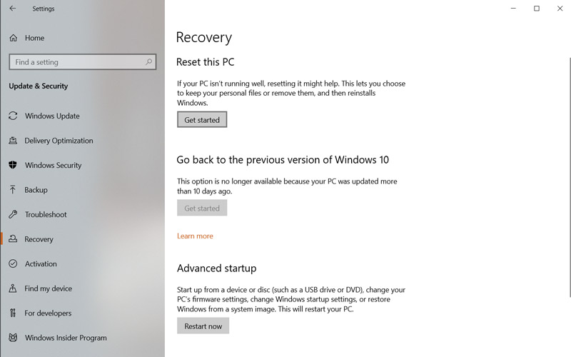 Click Start and go to Settings, choose the Update & Security, click Recovery on the left sidebar, and then click the Get started button under the Reset this PC section. To reboot your Dell laptop to factory settings, select the Remove everything option.