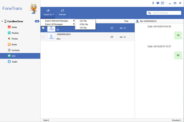 Todos os dados do iPhone serão exibidos como categorias diferentes, incluindo Jornalistas (música, filmes, podcasts, memorandos de voz, etc.), Playlists, Fotos, Livros, Contactos, SMS, etc. Selecione todos os arquivos que deseja salvar.