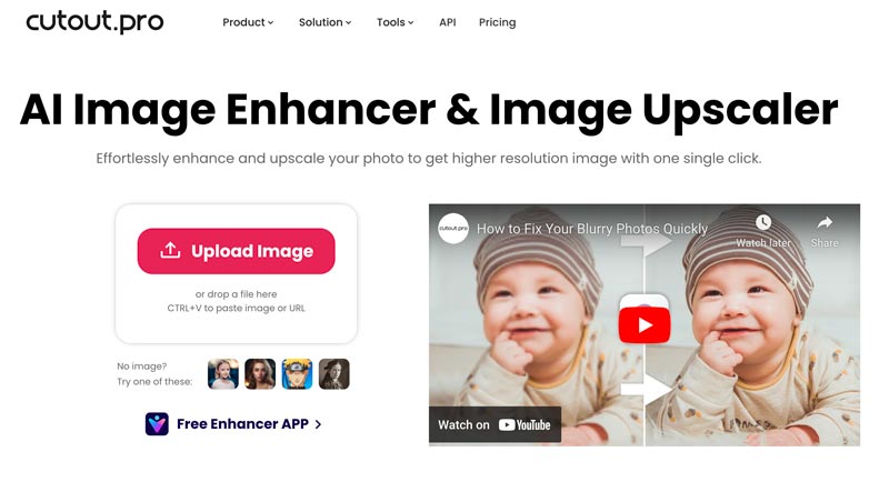 Cutout.pro é uma plataforma popular de design visual que oferece várias ferramentas de edição e criação de imagens com tecnologia de IA. Quando quiser aprimorar imagens e melhorar a qualidade, você pode acessar a página específica do AI Image Enhancer e Image Upscaler. Ele foi especialmente projetado para corrigir imagens pixeladas, borradas e de baixa resolução. Assim que sua foto for carregada, ela adicionará pixels automaticamente e fará outras operações de aprimoramento. Este intensificador de pixels online também permite cortar sua imagem e remover objetos indesejados.