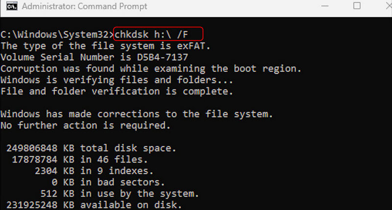 2º Passo. Modelo "chkdsk h: \ / F”. O "h” deve ser a letra do seu cartão SD.