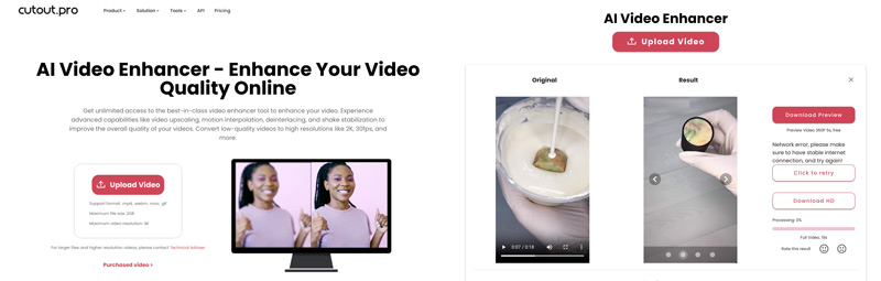 Geralmente, você precisa enviar seu arquivo de vídeo e deixar o upscaler online aumentar a resolução. Quando o 2K o vídeo é aumentado para 4K, você pode simplesmente baixar o vídeo 4K. Essas ferramentas online têm limitações quanto à duração do vídeo, recursos, qualidade de saída ou velocidade de processamento.
