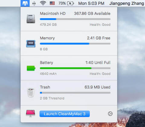 ➤ Monitore o status do Mac, como utilização do disco, status da bateria, uso da memória e uso da CPU.